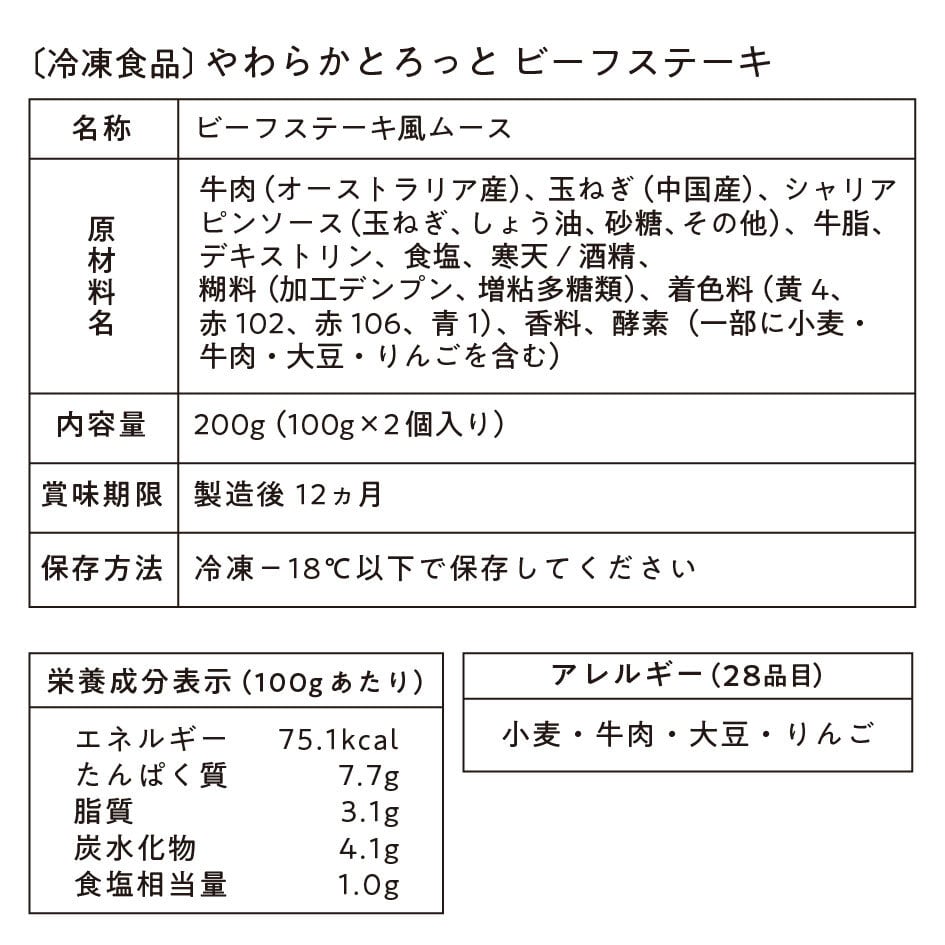 ◼︎原材料名:牛肉(オーストラリア産)、玉ねぎ(中国産)、シャリアピンソース(玉ねぎ、しょう油、砂糖、その他)、牛脂、デキストリン、食塩、寒天/酒精、糊料(加工デンプン、 増粘多糖類)、着色料(黄4、赤102、赤106、青1)、香料、酵素(一部に小麦・牛 肉・大豆・りんごを含む)