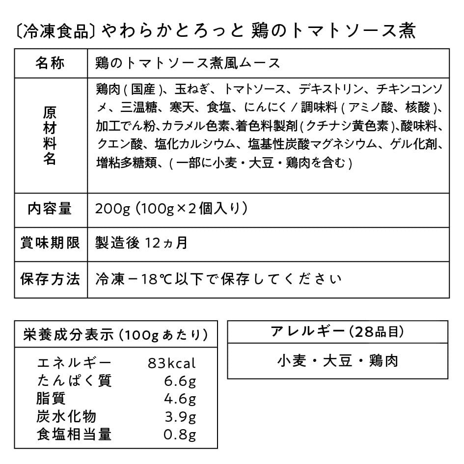 ◼︎原材料名:鶏肉(国産)、玉ねぎ、トマトソース、デキストリン、チキンコンソメ、三温糖、寒天、食塩、にんにく/調味料(アミノ酸、核酸)、加工でん粉、カラメル色素、着色料製剤(クチナシ黄色素)、酸味料、クエン酸、塩化カルシウム、塩基性炭酸マグネシウム、ゲル化剤、増粘多糖類、(一部に小麦・大豆・鶏肉を含む)